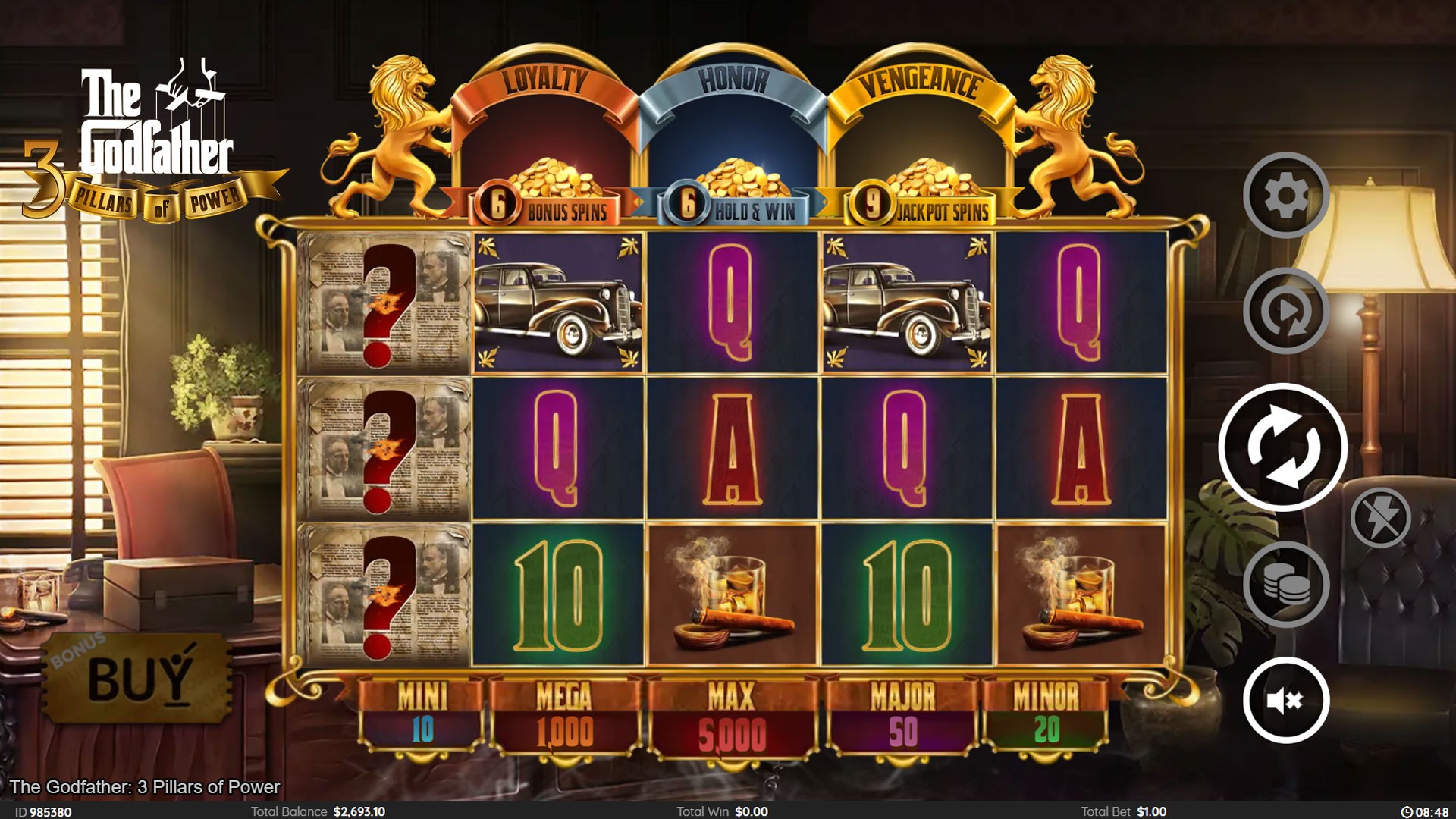 THE GODFATHER; 3 PILLARS OF POWER is the latest video slot from London based games studio Atlantic Digital. This 5x3, 20 line game features MYSTERY SYMBOLS plus 3 amazing bonuses; FREE SPINS, JACKPOT SPINS & a HOLD ‘N’ WIN round.
